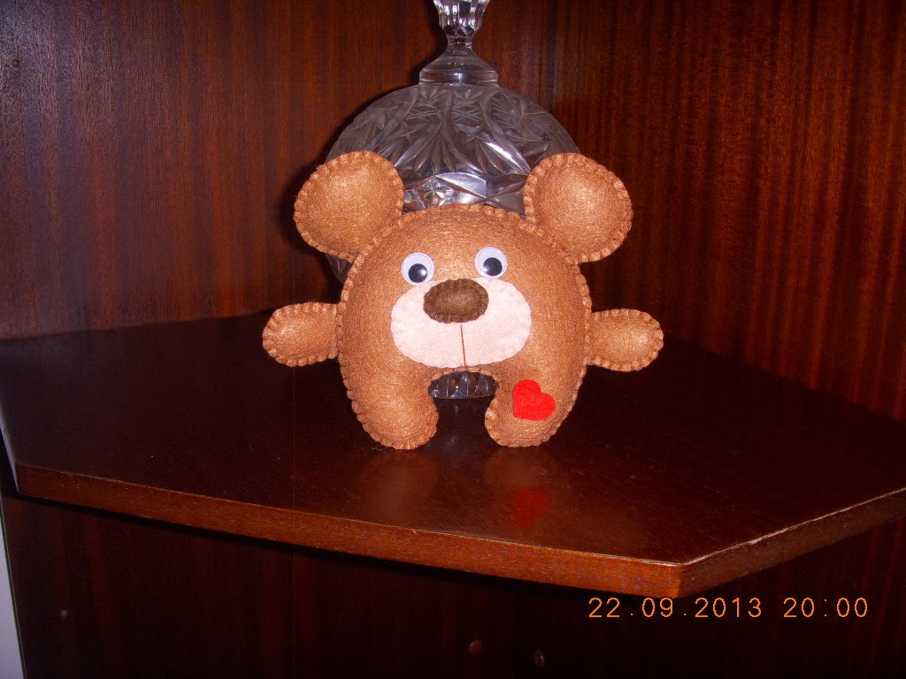 Aqui fica uma pequena doçura feita esta tarde, ursinho todo em feltro e feito á mão,depois deste vem uns quantos pois é a lembrançinha de b...